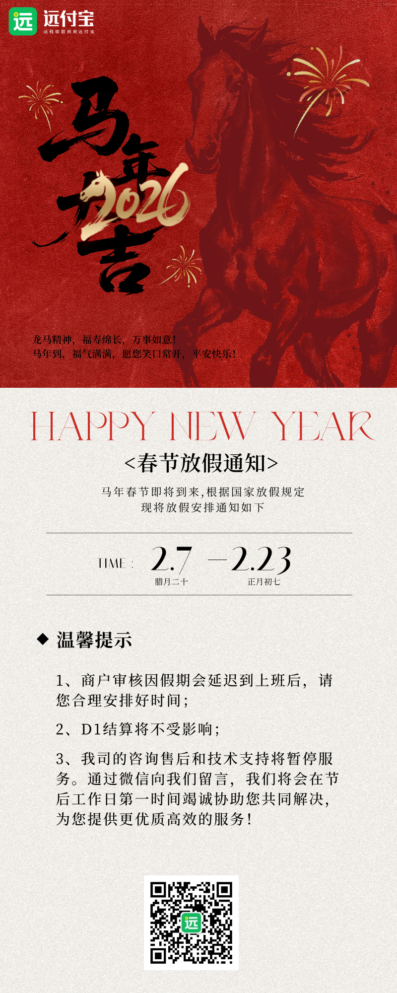 放假期间,已完成商户申请的商家如为D1结算将不受影响,同时我司的咨询售后和技术支持将暂停服务。如有需求或反馈,您可通过微信向我们留言,我们将会在节后工作日第一时间竭诚协助您共同解决,为您提供更优质高效的服务。